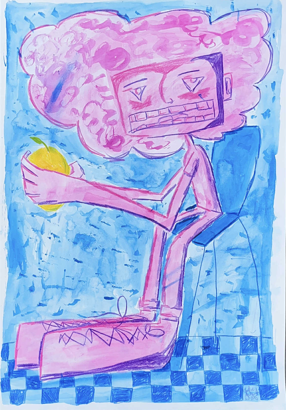 When life gives you lemons, what do you do with it? Sit and stare at it? Throw it at the wall? Make lemonade? The figure is contemplating what to do, indicated by the curved lines of their hair. However, society is boxing the figure in, indicated by the rigid quadrilateral shoes and head. So the question is, will the figure make lemonade as society expects them to, not do anything at all or will they go on and follow their dreams?